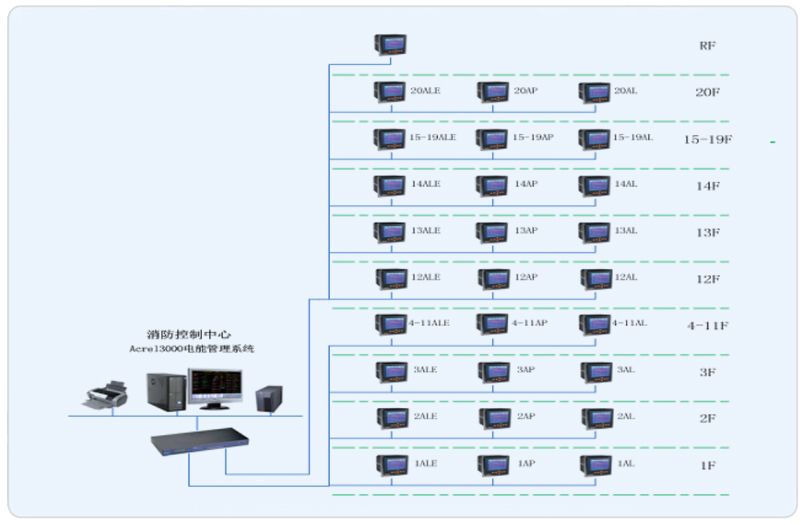 我司本項(xiàng)目承接其樓層部分電能管理系統(tǒng)搭建,完成對(duì)配電回路用電的實(shí)時(shí)監(jiān)控和管理。該項(xiàng)目進(jìn)出線回路均采用ACR多功能液晶顯示儀表,其是針對(duì)電力系統(tǒng)、公共設(shè)施、智能大廈的電力監(jiān)控需求而設(shè)計(jì)的網(wǎng)絡(luò)電力儀表,它能測(cè)量所有常規(guī)電力參數(shù),如:三相電壓、電流、有功功率、無(wú)功功率、功率因數(shù)、頻率、有功電度、無(wú)功電度。現(xiàn)場(chǎng)儀表以手拉手方式通過(guò)屏蔽雙絞線(RVVSP2*1.0)進(jìn)行通訊連接,每根總線連接智能儀表數(shù)量在20只左右,不同種類的智能裝置連接在不同的總線上,然后將數(shù)據(jù)上傳至數(shù)據(jù)采集器,進(jìn)而將數(shù)據(jù)上傳至當(dāng)?shù)乇O(jiān)控終端。