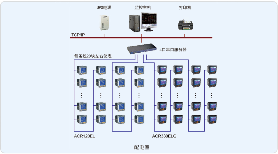 整個系統采用網絡分布式結構,監控主機位于地下一層變電所值班室內,配電柜內安裝有本公司ACR330ELH、ACR120EL儀表共計60多回路。仁恒河濱花園電力監控系統現場共1個低壓配電室,配電室內采用安科瑞ACR系列電力監控儀表采集各回路的電流、電壓、電能等電參量,然后通過中間層采集設備網線到監控室計算機上,實現遙測、遙信功能。