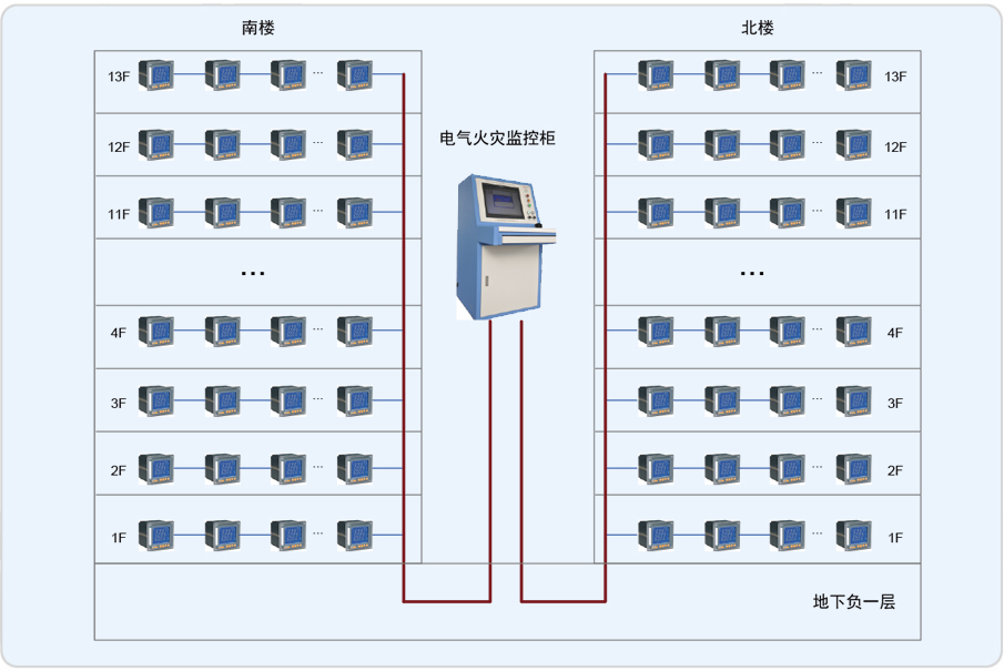 現(xiàn)場(chǎng)設(shè)備層是數(shù)據(jù)采集終端,主要由ARCM100-Z剩余式電氣火災(zāi)監(jiān)控探測(cè)器。可監(jiān)測(cè)漏電流,各相電纜溫度信號(hào),每路通道具有斷線、短路檢測(cè)功能;具有事件存儲(chǔ)功能,報(bào)警器能夠記錄報(bào)警發(fā)生的時(shí)間、類型、參數(shù),根據(jù)報(bào)警記錄可以分析現(xiàn)場(chǎng)的用電情況,為消除故障提供依據(jù);采用現(xiàn)場(chǎng)總線通信技術(shù),上位機(jī)管理軟件可以時(shí)刻監(jiān)控現(xiàn)場(chǎng)的運(yùn)行情況,及時(shí)發(fā)現(xiàn)報(bào)警信息。現(xiàn)場(chǎng)總線連接的分布式I/O控制器構(gòu)成數(shù)據(jù)采集終端,向數(shù)據(jù)中心上傳采集的數(shù)據(jù)。