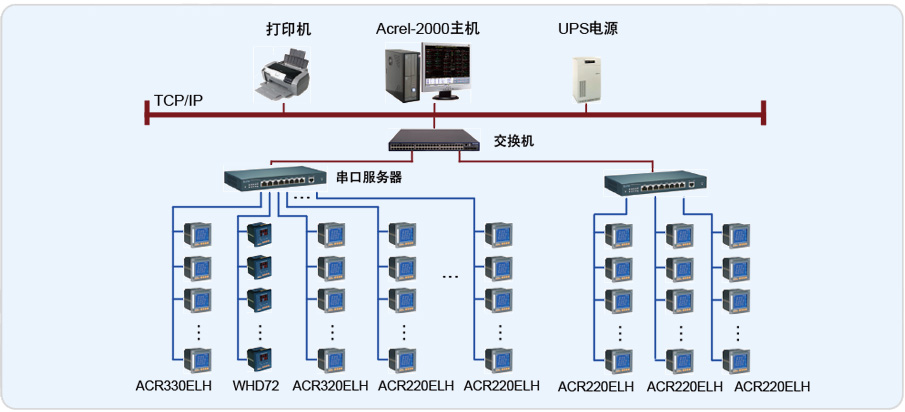 該院新建大樓系統分為配電室和樓層部分,配電室高壓部分采用ACR330ELH采集諧波數據,WHD72采集溫濕度數據;低壓進線側采用ACR320ELH采集諧 波、功率因數等數據, ACR220EK網絡電力儀表采集測量電流,開關狀態由輔助觸點接入ACR220EK儀表的DI(開關量輸入)接口。樓層部分由ACR220E采集電能數據。所有電參量數據由儀表的通訊接口經RS-485總線傳給上位機,實現遙測、遙控和遙信功能。