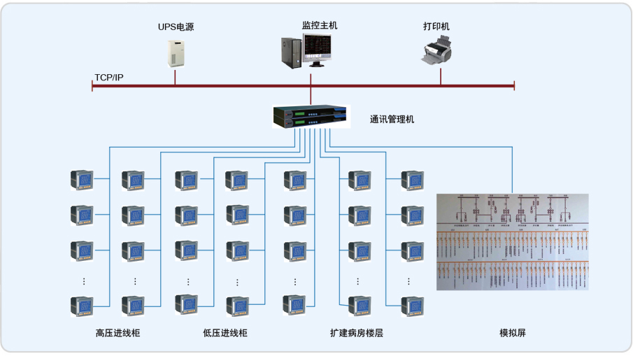 甘上海華山醫(yī)院病房樓是一幢醫(yī)用建筑,建筑面積約為2萬平方米。根據(jù)配電系統(tǒng)管理和能耗監(jiān)測的要求,需要對樓內(nèi)的高壓進線、低壓配出線和各樓層內(nèi)配電箱進行電力監(jiān)控,以保證用電的安全、高效。