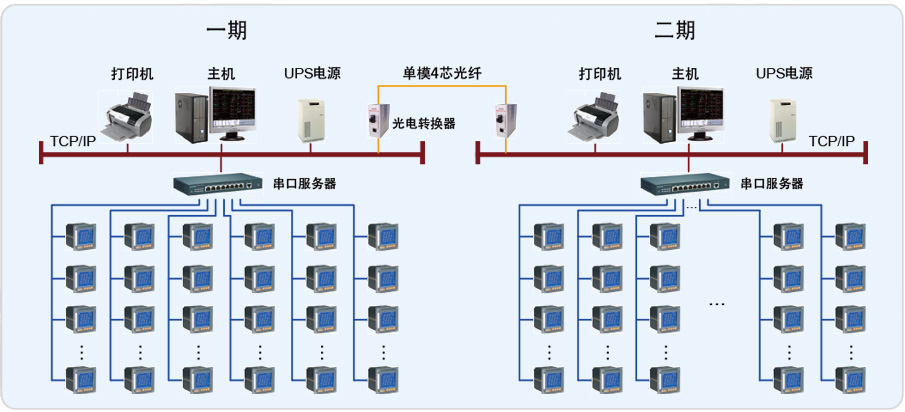 一期配電房由兩個(gè)相互獨(dú)立的配電房組成,動(dòng)力中心配電房包含主室和次室,次室距主室的約30米。其中Acrel-2000電力監(jiān)控系統(tǒng)在動(dòng)力中心配電室的次室里。動(dòng)力中心配電房有2臺(tái)變壓器(1#變壓器、2#變壓器),共有57臺(tái)ACR120EL;現(xiàn)場采用4根屏蔽雙絞總線連接。生產(chǎn)車間配電房中有2臺(tái)變壓器(3#變壓器、4#變壓器),共有39臺(tái)智能儀表,現(xiàn)場采用2根RS485總線上傳至主機(jī)。
