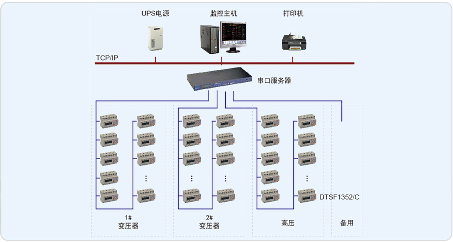 該現(xiàn)場(chǎng)為高壓10kV和0.4KV低壓配電室,共53塊儀表多功能智能儀表( DTSF1352/C),監(jiān)控值班室位于變電所隔壁,通過(guò)組態(tài)軟件Acrel-2000實(shí)現(xiàn)對(duì)現(xiàn)場(chǎng)儀表的實(shí)時(shí)監(jiān)測(cè),并記錄歷史數(shù)據(jù)自動(dòng)生成報(bào)表,以便查詢。為滿足配電室統(tǒng)一監(jiān)控的要求,配電現(xiàn)場(chǎng)安裝的安科瑞公司網(wǎng)絡(luò)電力儀表通過(guò)屏蔽雙絞線手拉手式相連至后臺(tái)主機(jī)內(nèi)的工業(yè)串口卡,實(shí)現(xiàn)對(duì)現(xiàn)場(chǎng)數(shù)據(jù)的采集,存儲(chǔ),處理,實(shí)時(shí)顯示以及歷史查詢。