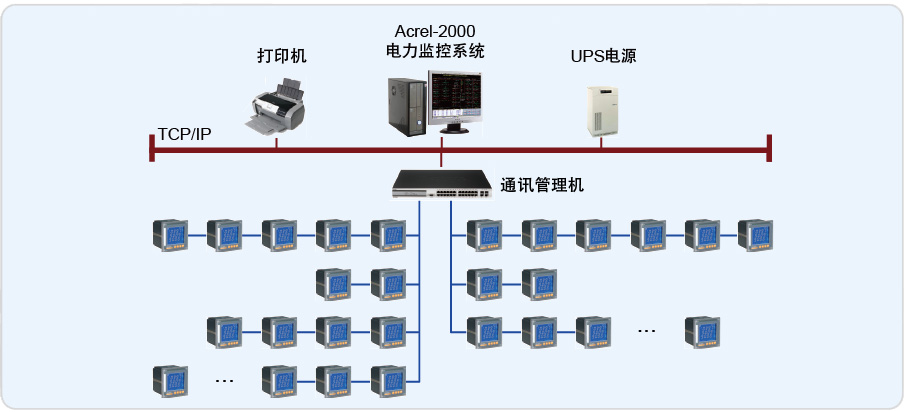 采用Acrel-3000電能管理系統實現遠程電參量(電流,電壓,功率,功率因素等)實時監測與分類電能計量。以現場測得的最大需量(MD)與系統預先設定的需量限定值進行比較,在超量時報警。監控系統主要分為3層:站控管理層(工控機、打印機、UPS電源)、通訊管理層(4口通訊管理機)、現場設備層(現場智能裝置)。現場中的IO設備的通訊線纜采用RVSP 2*1.5屏蔽雙絞線,連接至4口通訊管理機。選配ACR220EL/K的多功能儀表,具有 LCD液晶屏顯示,可監測三相電流、三相電壓、電網頻率、三相(有功功 率、無功功率、功率因數)、三相有功電能、三相無功電能6項測量參數。