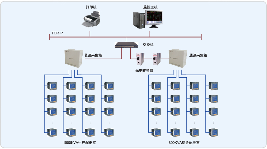山東電力管道工程公司有兩個(gè)配電室:容量1500KVA的生產(chǎn)配電室和800KVA的宿舍配電室,兩個(gè)配電室距離約1500米,為實(shí)現(xiàn)配電系統(tǒng)的規(guī)范化管 理,對舊的配電系統(tǒng)進(jìn)行改造,兩配電室內(nèi)的老式指針式儀表更換為上海安科瑞公司的網(wǎng)絡(luò)電力儀表,配套Acrel-2000電力監(jiān)控軟件對現(xiàn)場進(jìn)行監(jiān)控,監(jiān)控室位于生產(chǎn)配電室內(nèi)。為滿足兩個(gè)配電室統(tǒng)一監(jiān)控的要求,容量1500KVA的生產(chǎn)配電室和800KVA的宿舍配電室通過一根單模四芯的光纖相連,經(jīng)光電轉(zhuǎn)換后接入網(wǎng)絡(luò)交換機(jī),進(jìn)而實(shí)現(xiàn)對現(xiàn)場數(shù)據(jù)的采集,存儲,處理,實(shí)時(shí)顯示以及歷史查詢。