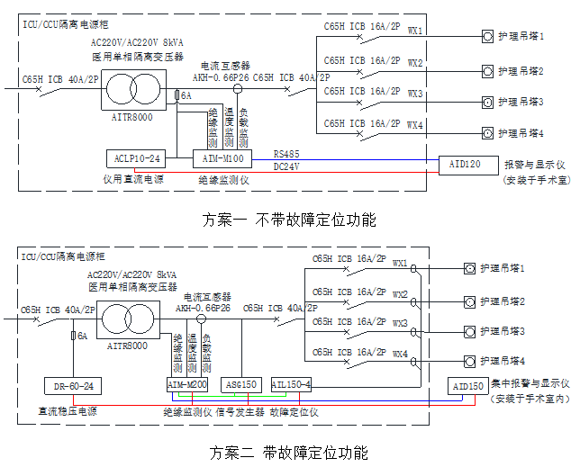 注:在重癥監護室的配電解決方案中,AID系列集中報警與顯示儀應該安裝在護士站內,由護士站的醫務人員來監視各隔離電源系統的運行狀況。