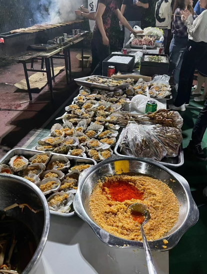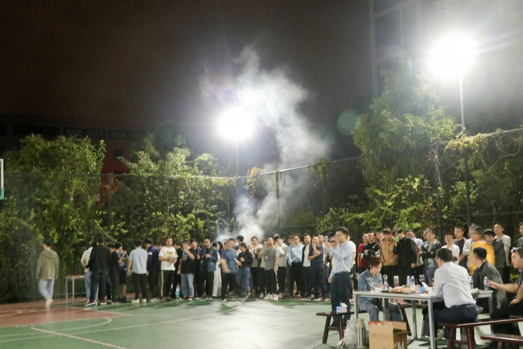 漫步籃球場,夜幕已經降臨,氣氛逐漸活躍。大家的熱情如同滾燙的爐火,沖散了寒露時節的絲絲涼意。籃球場圍滿了觀眾,燒烤攤邊炊煙裊裊,餐桌上擺滿了飲料啤酒,今晚是狂歡盛宴!甩開平日里的拘束,此刻,只有朋友、燒烤、酒、音樂!