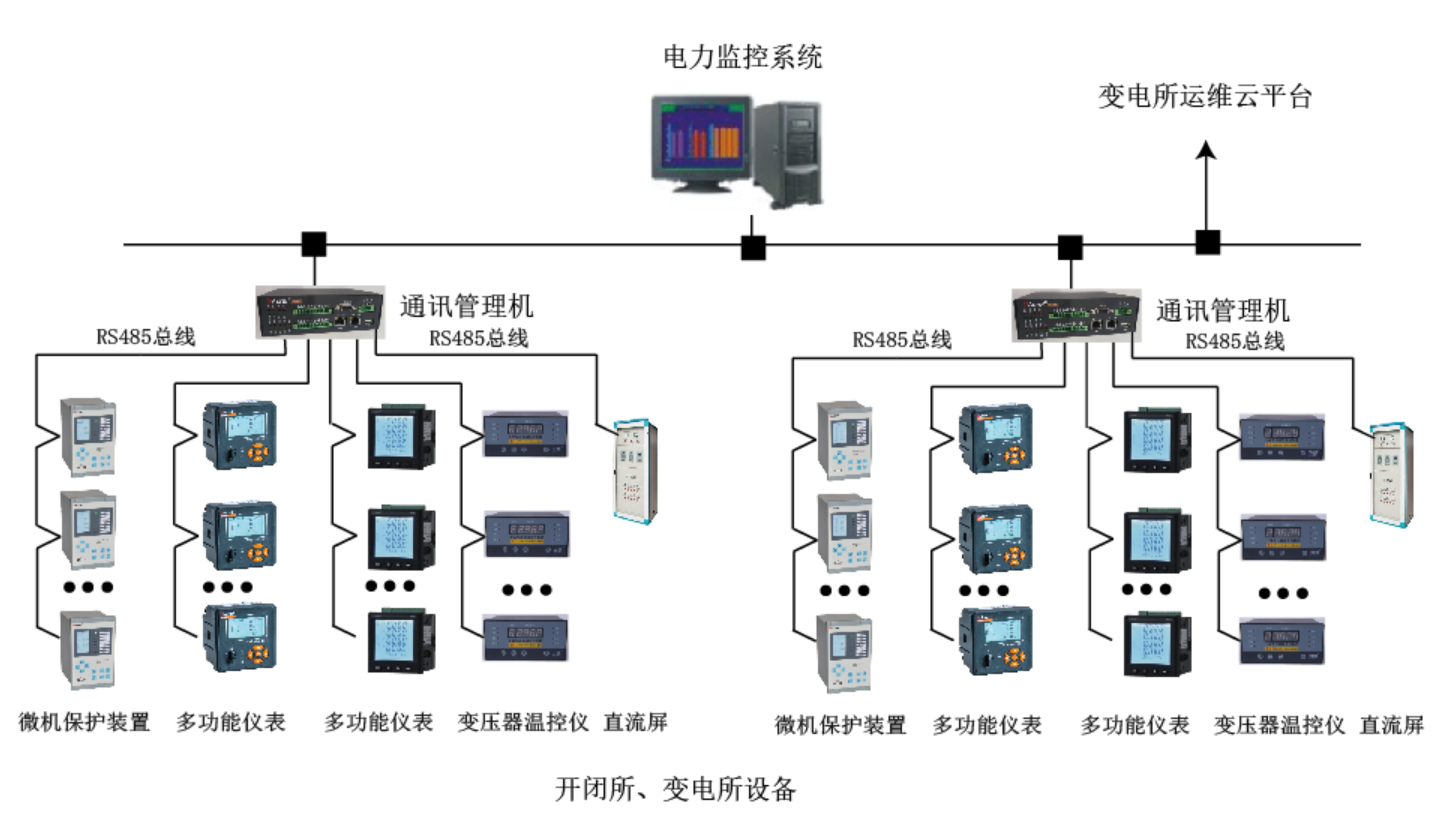 系統采用分布式結構,微機保護裝置、多功能儀表、變壓器溫控器、直流屏、柴油發電機控制屏等設備通過RS485總線或者以太網接入智能網關,經過協議轉換、數據處理后上傳至電力監控系統,實現遙測、遙信、遙控、異常報警等功能。