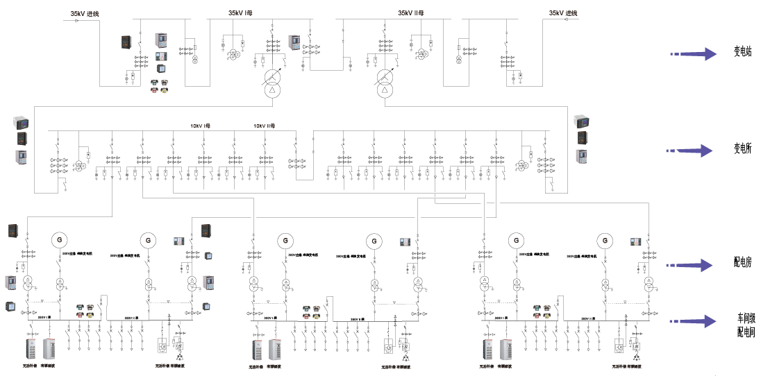 電力監控系統主要針對開閉所和10/0.4kV變電所,對高壓回路配置微機保護裝置及多功能儀表進行保護和監控,對0.4kV出線配置多功能計量儀表,用于測控出線回路電氣參數和用能情況。同時對藥企廠區重要設備如柴油發電機、無功補償裝置、有源濾波裝置、UPS、隔離電源系統狀態進行監測。
