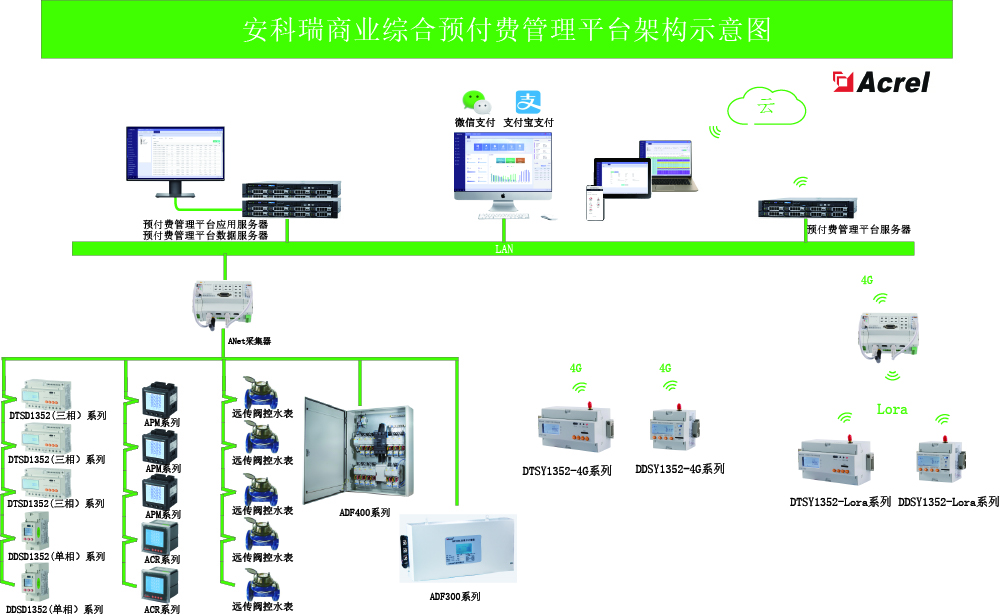 商業(yè)中心的能源消耗比重較大,商業(yè)用樓的節(jié)能問題正越來越受到人們的重視。傳統(tǒng)方式的抄表管理人工成本高、抄表數(shù)據(jù)易出錯(cuò)、還常常面臨追繳費(fèi)困難的問題。商業(yè)預(yù)付費(fèi)系統(tǒng)有效的解決了以上問題,還通過對(duì)能源數(shù)據(jù)的集中統(tǒng)一采集、對(duì)比、分析提高能源利用率,實(shí)現(xiàn)高效的節(jié)能,提高經(jīng)濟(jì)效益的同時(shí)提升辦公樓整體形象。該系統(tǒng)采用后臺(tái)自動(dòng)和手動(dòng)拉合閘操作,采用短信通知等人性化管理手段提前通知用戶繳費(fèi),支持微信支付寶等多種繳費(fèi)方式,使得預(yù)付費(fèi)管理靈活可靠。 同時(shí)后臺(tái)自動(dòng)生成賬單,并進(jìn)行用電分析,大大提高了用能的智能化管理。本系統(tǒng)充分滿足了用戶的差異化用能環(huán)境和管理需求,是經(jīng)濟(jì)和實(shí)用的用能收費(fèi)管理系統(tǒng)。