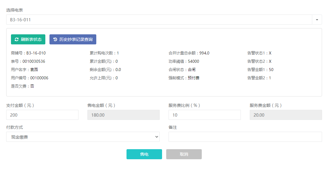 可以對(duì)已開戶的電表進(jìn)行遠(yuǎn)程售電,電費(fèi)實(shí)時(shí)下發(fā)到電表,電表會(huì)根據(jù)電度走字實(shí)時(shí)扣除電費(fèi)。售電可以設(shè)置服務(wù)費(fèi)比例,實(shí)際充值到表中的金額將按比例扣除服務(wù)費(fèi)之后再下發(fā),作為物業(yè)增加收取服務(wù)費(fèi)的渠道。