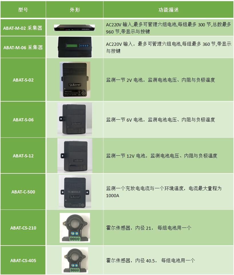 該系統具有監測電池的電壓、內阻與內部溫度功能,安裝、維護與接入非常方便。系統主要由ABAT-S模塊、ABAT-C模塊及ABAT-M采集器組成,可通過采集器查詢告警與實時數據、設置參數等,可選配監測平臺實現網絡化集中管理。